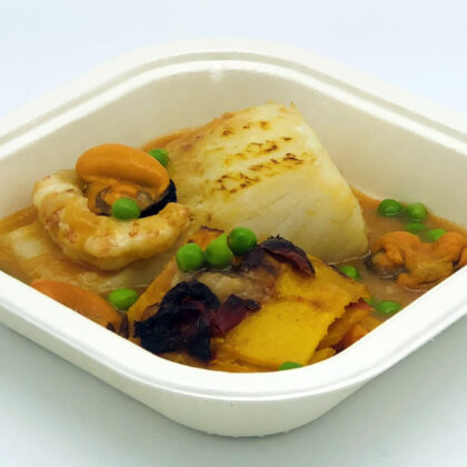 Guiso mariñeiro tradicional no que os protagonistas son os Produtos Galegos de Calidade: Pescada de Burela, Mexillón de Galicia e Pataca de Galicia.