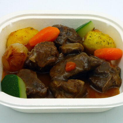 Estofado de Xarrete de Tenreira Galega (IXP Tenreira Galega) realizado a lume lento e acompañado de hortalizas glaseadas e Pataca Galega (IXP Pataca de Galicia).